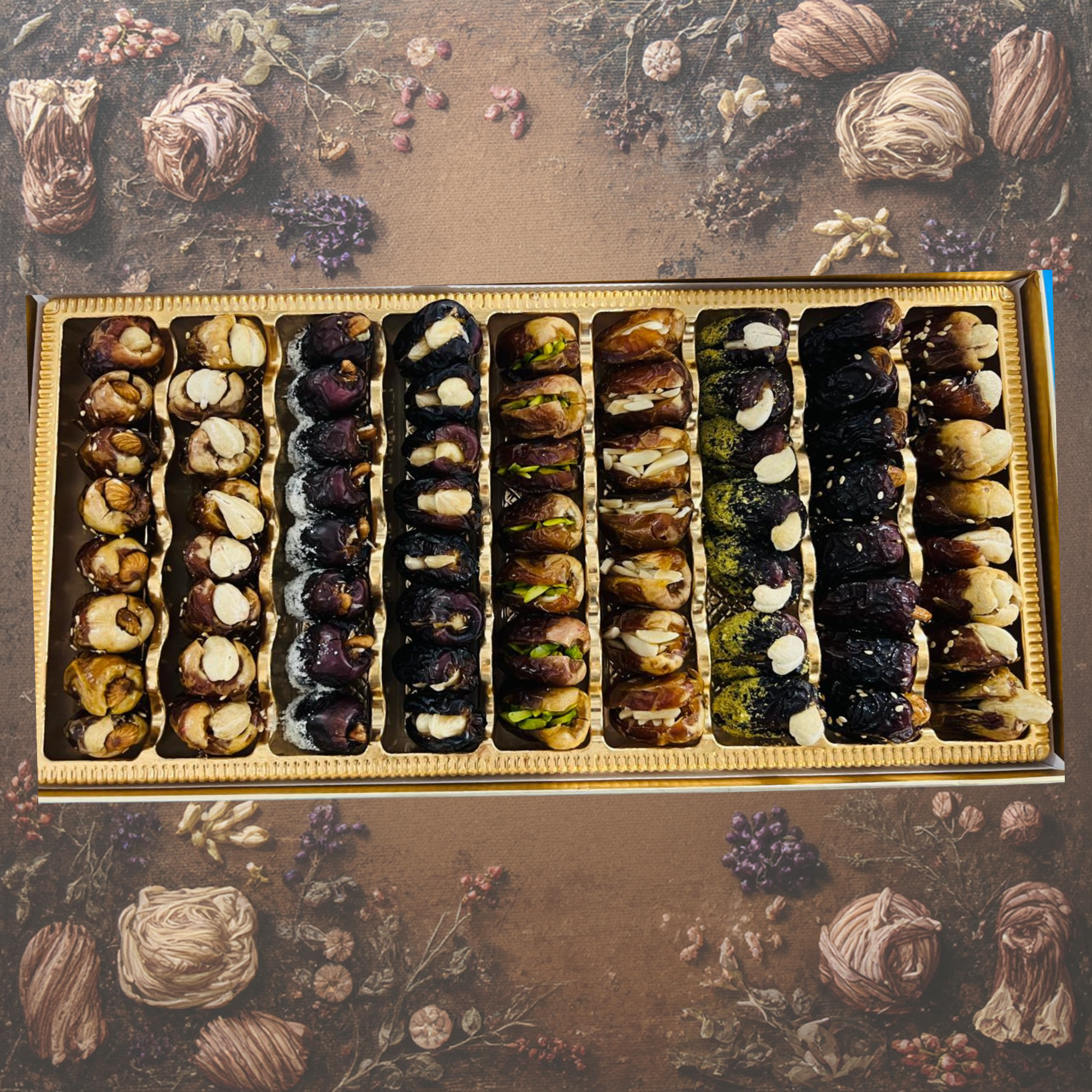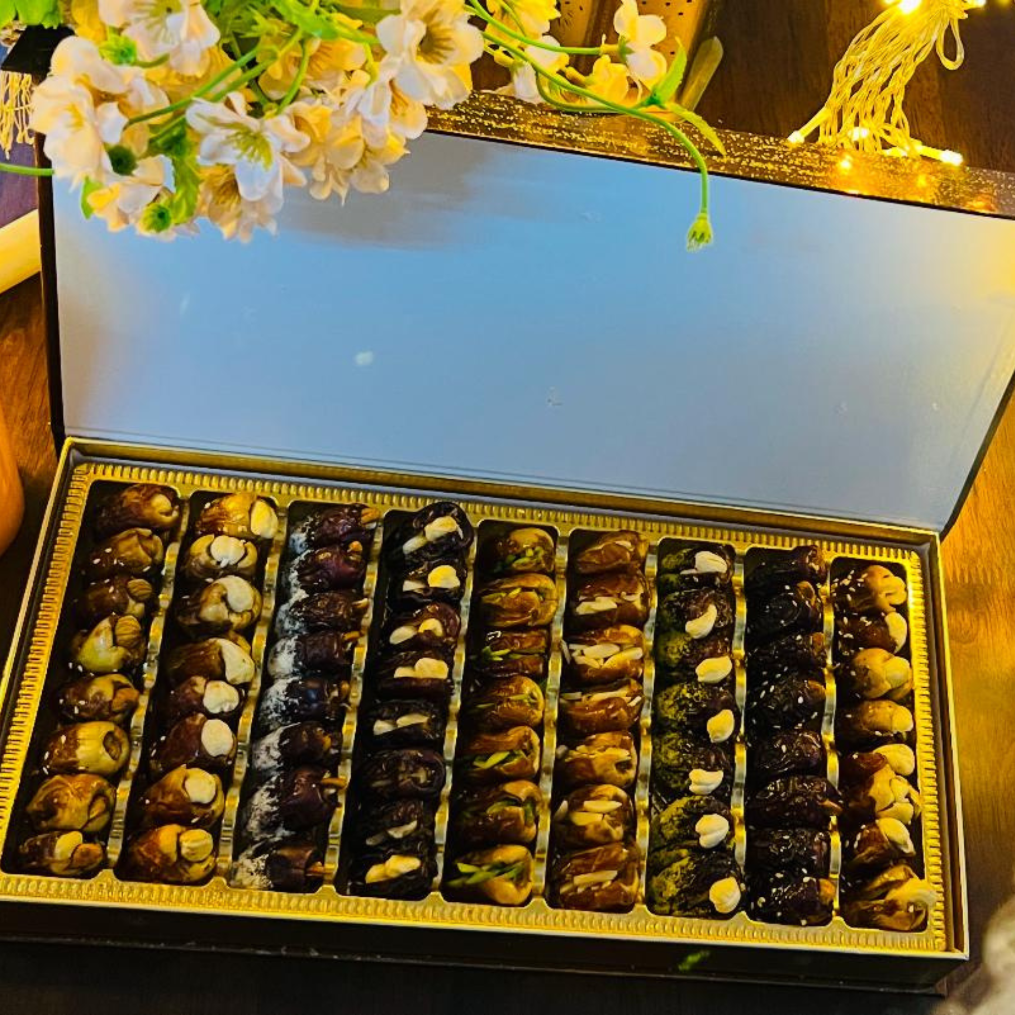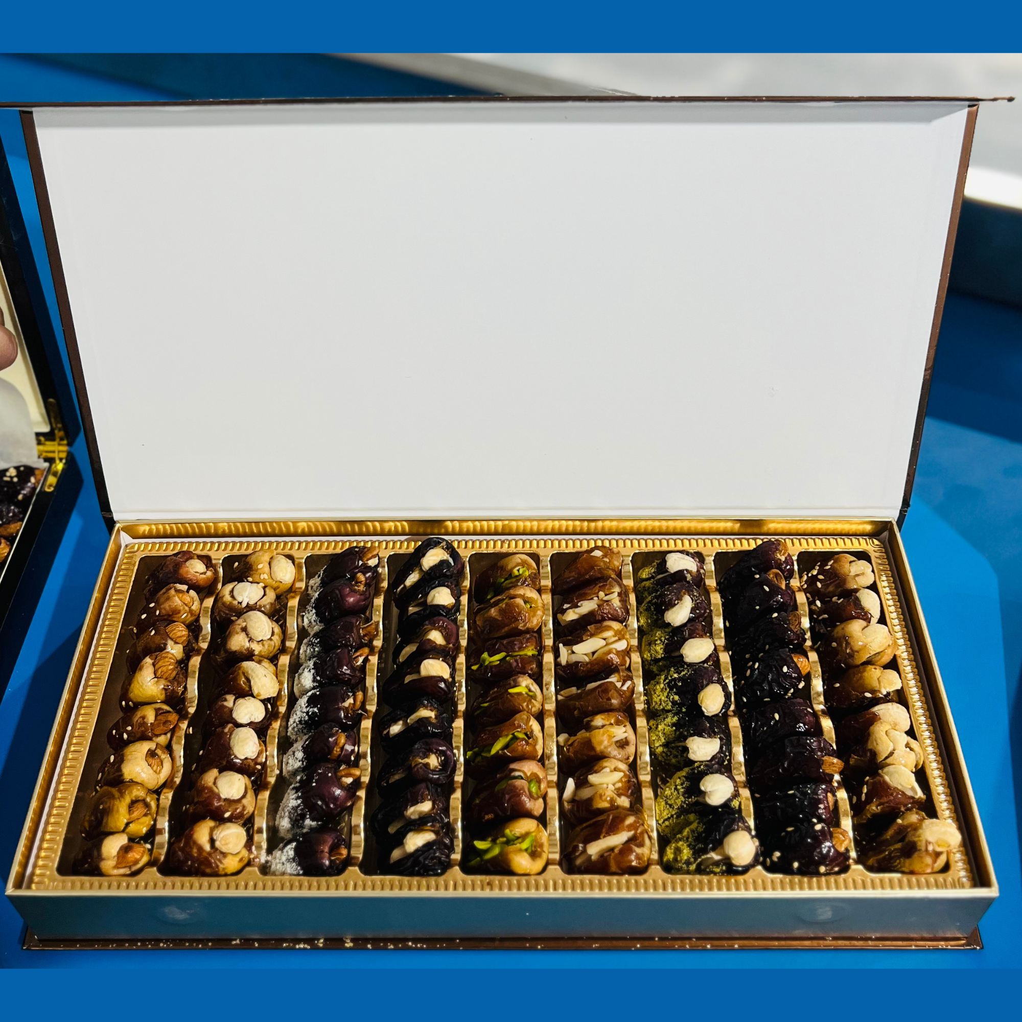 This Grand Ramadan Box showcases an impressive assortment of stuffed dates, including nut-filled, coconut-coated, and pistachio-topped varieties. Ideal for large gatherings and special Ramadan gifting.