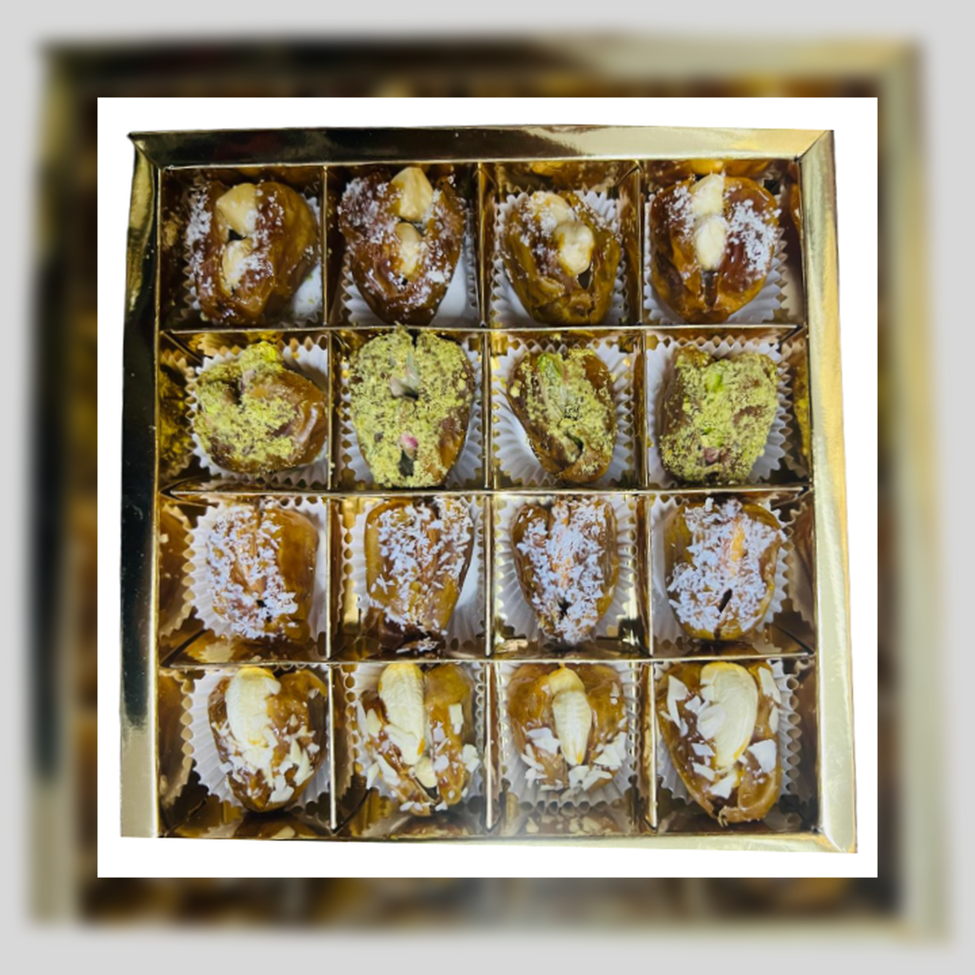 This beautifully arranged gold tray features a variety of premium dates, filled with almonds, pistachios, and cashews, and finished with delicate toppings. Each piece is individually placed to preserve freshness and presentation.